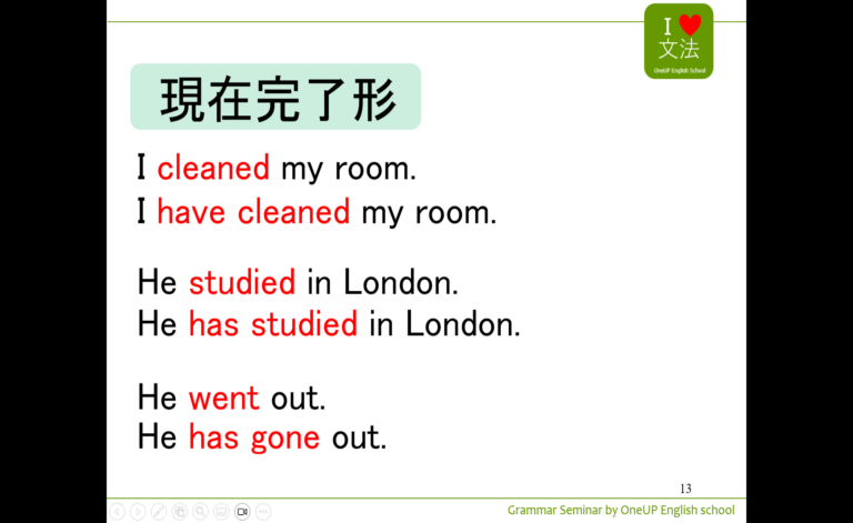 基本的な時制の使い分けでまずは目からウロコがポロっと落ちます。クライマックスは過去形と現在完了の違い。ここは必ず理解できるように徹底的に解説します!また、基本的な時制は理解しているけど会話では間違えてしまう、、、という方に向けたコツの指南も。
